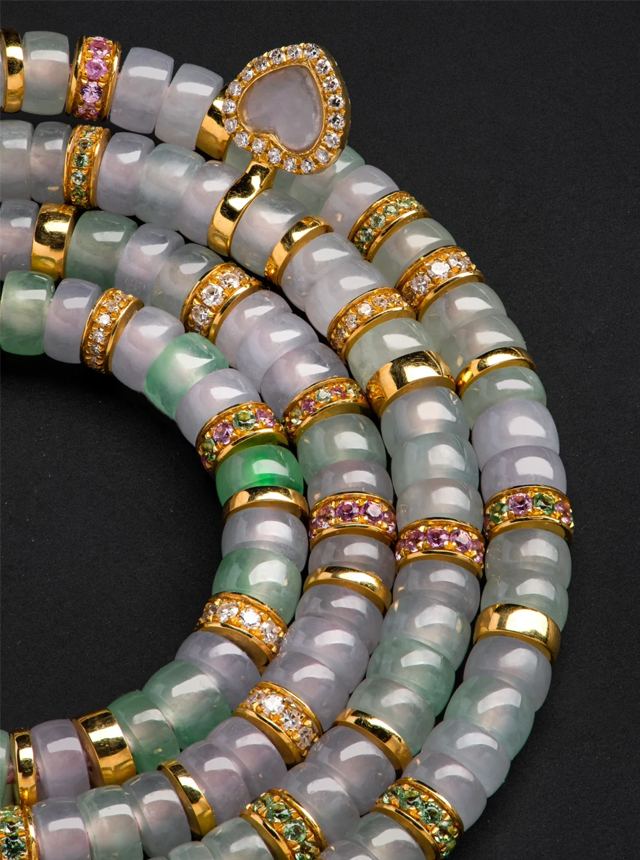 Gentle lavender blends with fresh, sweet green, while an icy white base flows like spring tides. Each bead boasts exceptional quality and translucency, radiating a luminous aura within its crystalline clarity. Geometrically patterned gold and diamond spacers interweave throughout, while a heart-shaped jadeite pendant adorned with gold tassels embodies both a contemporary expression of classical poetry and a romantic experiment in color and material.