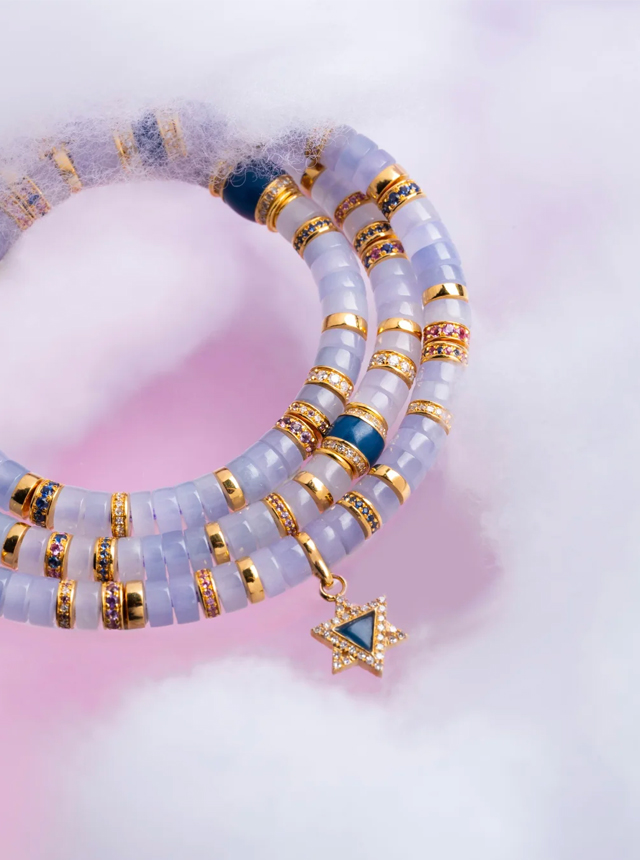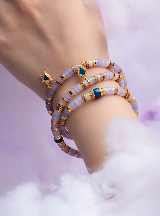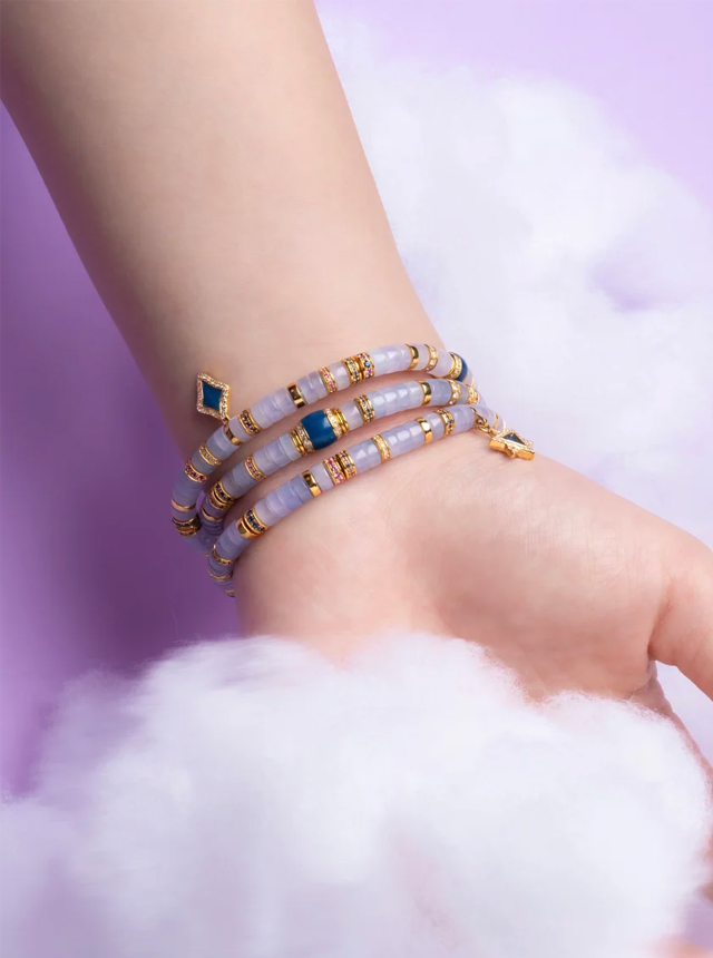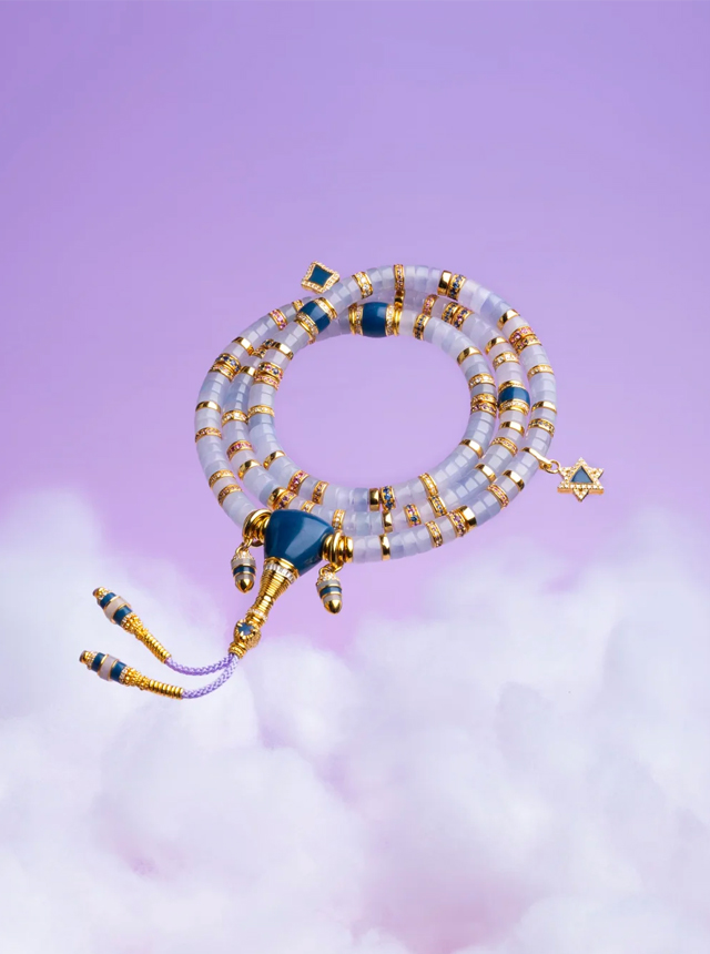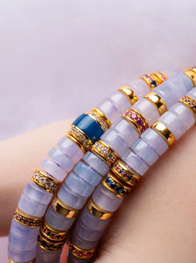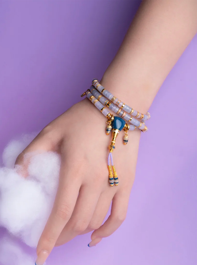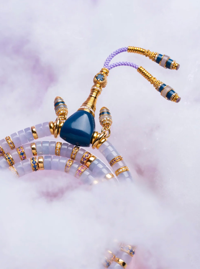 The Dreamy Fantasy Collection reveals multiple facets. The original design Jade Shu Ju Lai set features a delicate pendant suspended from the ceiling. Crafted from a single cut purple jadeite, it glows with the soft, translucent hue of dawn’s first purple mist—cool yet commanding. Paired with the equally cool-toned blue Shu Ju Lai, the colors harmoniously complement each other. Enhanced with 22K gold, diamonds, and hand-set colored gemstones, the collision of cool tones creates an unexpectedly tender harmony. Specifications: 5mm
