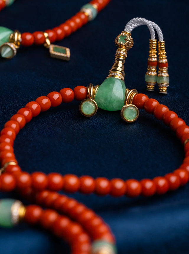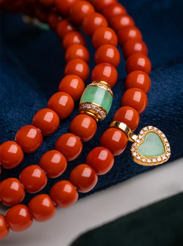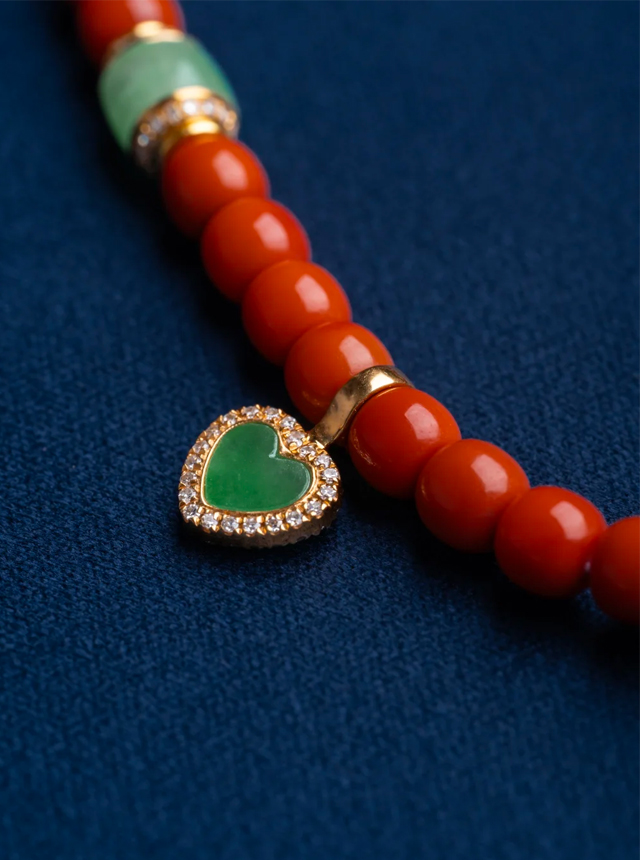 Rich persimmon-red jadeite from Southwest China boasts a dense, fine texture with a hue more vivid and pure than ordinary persimmon red. Paired with Burmese glutinous ice jadeite, the crisp sweet green and persimmon red create a perfect visual balance—fresh and refined yet undeniably noble and elegant.