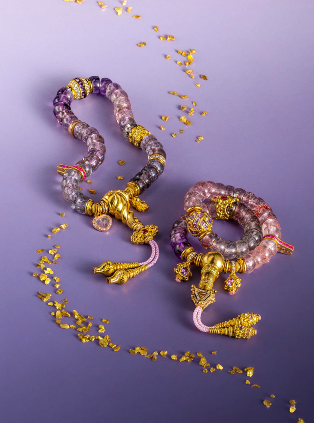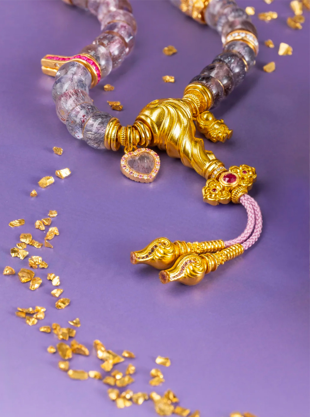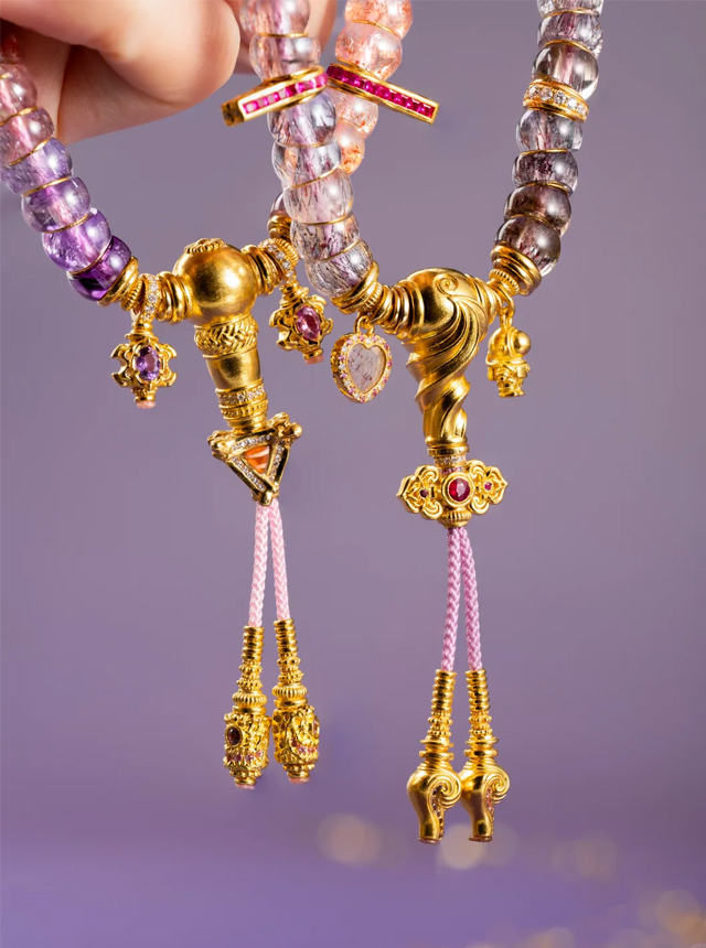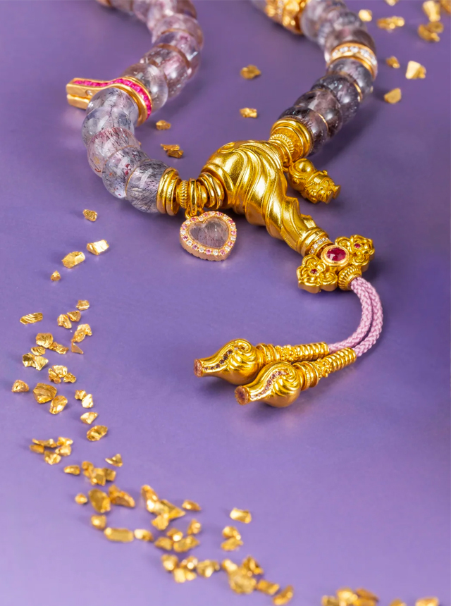 Beveled pearl-cut craftsmanship conceals gold flakes within the strands;